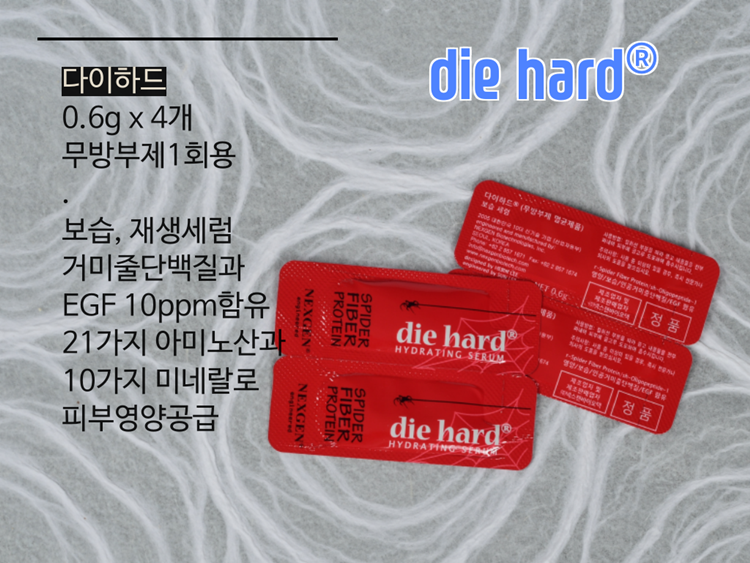 다이하드는 미니하루의 성분에 거미줄단백질과 EGF 10ppm을 함유시켜 재생기능을 강화한 수성세럼이에요. 거미줄단백질은 콜라겐과 같은 탄력섬유의 대체물질로 피부에 탄력을 보충해줘요.