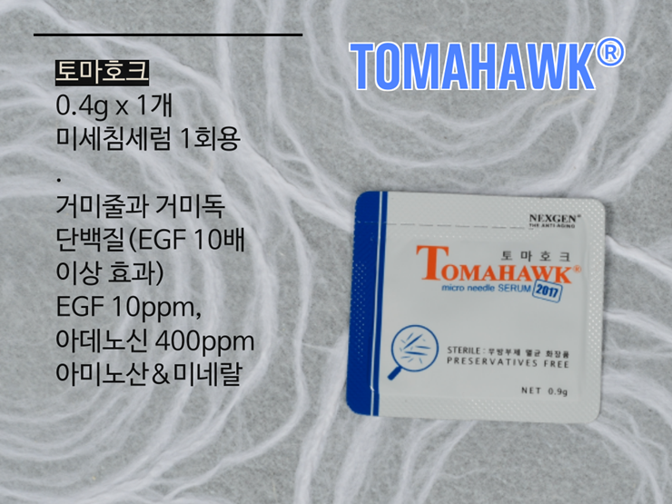 토마호크는 샵전용 제품인 닌자더고스트의 홈케어 제품으로 동일한 성분에 미세침의 함량만 적은 주름, 탄력관리용 미세침 세럼이에요. 토마호크에는 거미줄과 거미독 단백질이 들어가 단일 EGF의 효과보다 월등한 효능을 기대할 수 있어요.