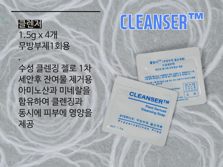 클렌저는 수성 클렌징젤이에요. 1차 오일클렌징 후 나머지 잔여물을 자극없이 부드럽게 제거해 줘요. 100% 수성젤로 사용후 피부가 당김이 없고 촉촉한 상태로 유지해줘 민감한 피부에 적합한 세안제에요.