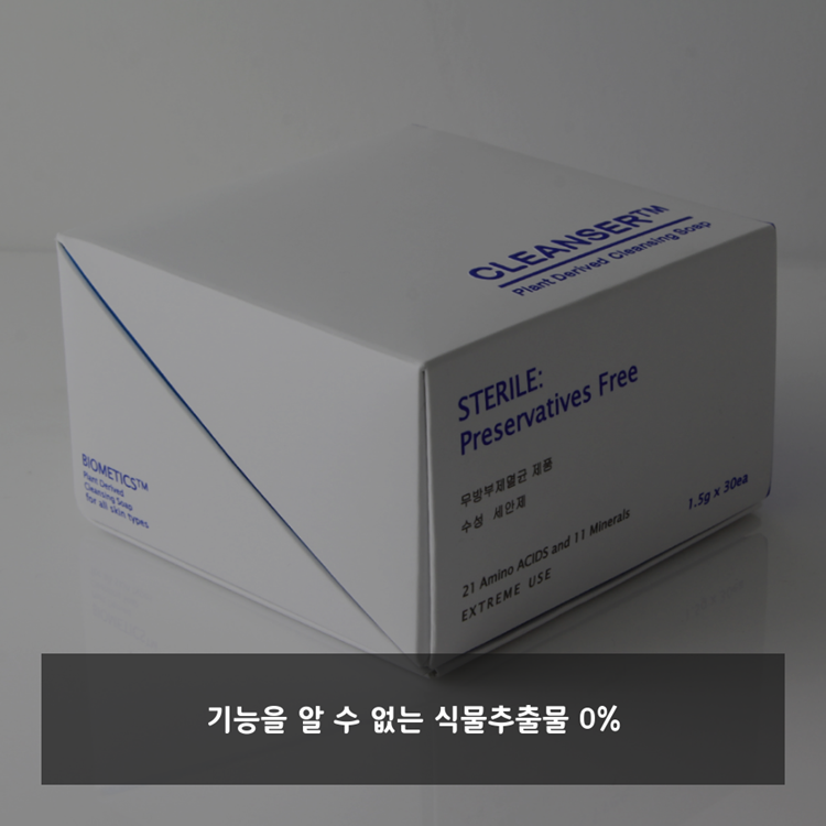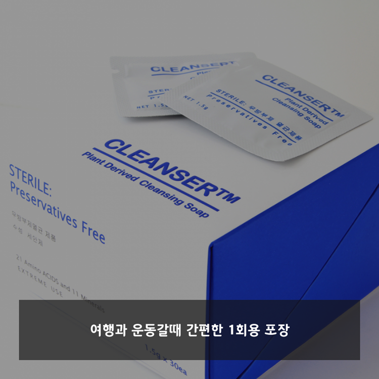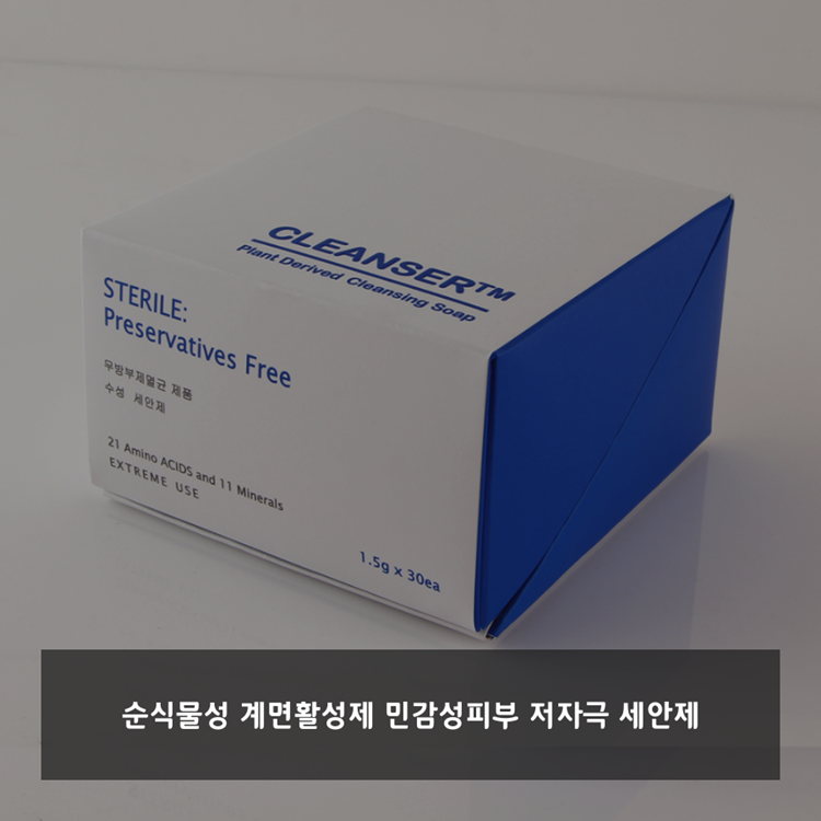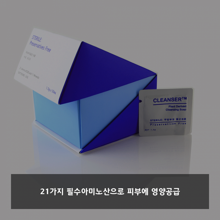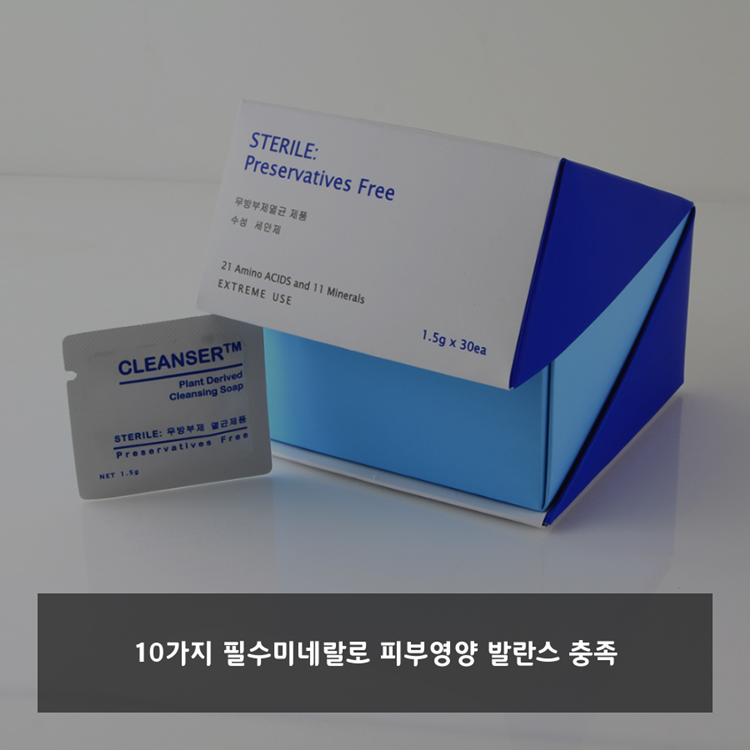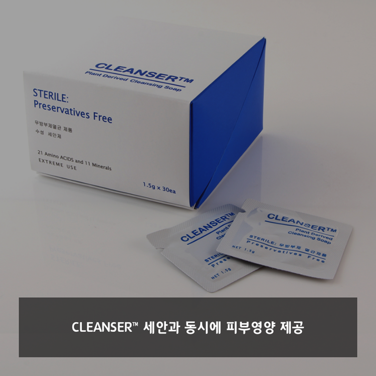 클렌저는 무방부제 멸균 처리된 수성 세안제입니다. 순식물성 유래 계면활성제 기반의 저자극 세안제이며, 동시에 21가지 필수 아미노산과 10가지 미네랄이 피부에 영영을 제공하게 됩니다.