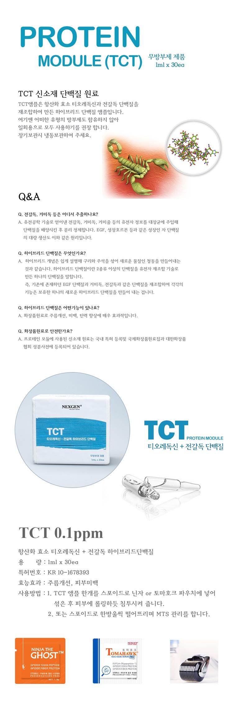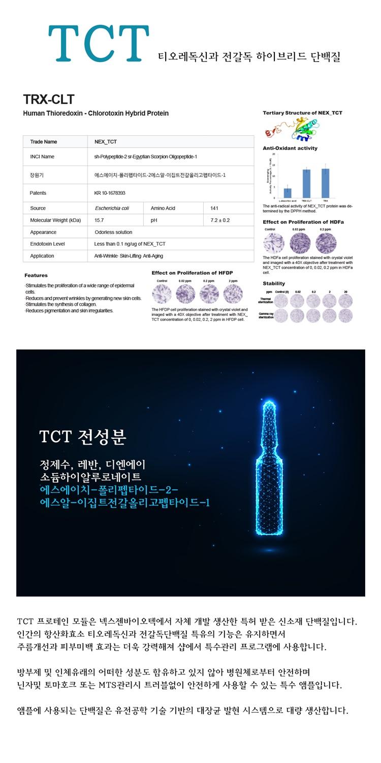 TCT단백질은 고기능성 하이브리드 단백질 생산기술을 접목한 "인간-전갈 이종 간 하이브리드 단백질"로 피부 세포 증식효과및 항상화 효과가 매우 뛰어납니다. TCT는 인간 티오레독신과 전갈독을 포함하는 융합단백질로 L-아스코르브산(비타민C)보다 약 4배 높은 자유라디칼 소거 기능을 가집니다.