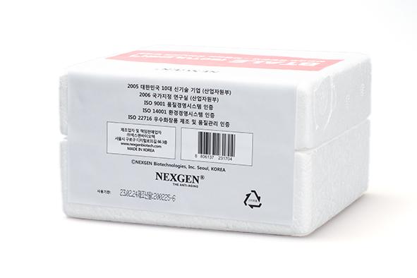 넥스젠에서 자체 개발/생산하여 특허 받은 신소재 단백질로 유전공학 기술 기반의 대장균 발현 시스템으로 대량생산한 하이브리드 단백질입니다. 동물성 유래의 어떠한 성분도 함유하고 있지 않아 병원체의 전이로 부터 안전합니다.