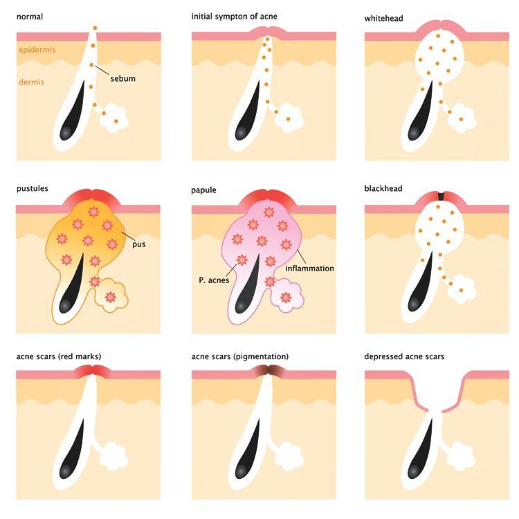 모공속에서 떨어져나간 각질과 피지가 밖으로 제대로 배출이 되지 않게 되면 모공이 막히게되고 여기에 세균이 번식하게 되는데 이때 번식된 세균(P.Acne균)은 주위 조직을 파괴하여 염증을 유발하게 되는 것이다.